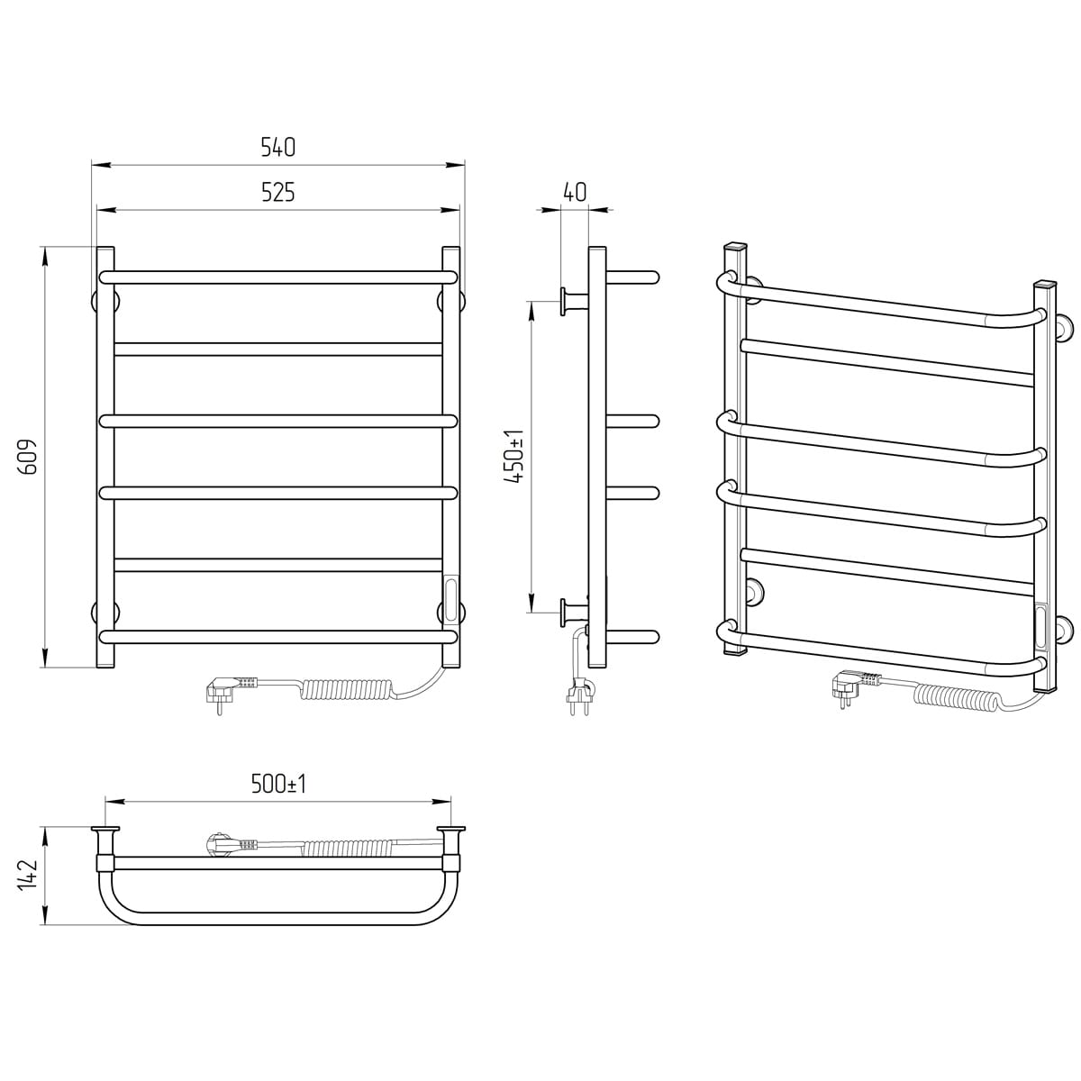 Особливості: керує нагрівом електрорушникосушарки мікропроцесорний термоконтроллер (кнопкове управління). Для початку роботи необхідно задати температуру рушникосушарки. Термодатчик контролює температуру поверхні рушникосушарки, що виключає можливість її перегріву. Серед переваг регулятора - зберігання обраного режиму роботи (при відключенні робота відновитися в запрограмованому користувачем режимі), наявність таймера відключення (3h) і колірної індикації роботи!