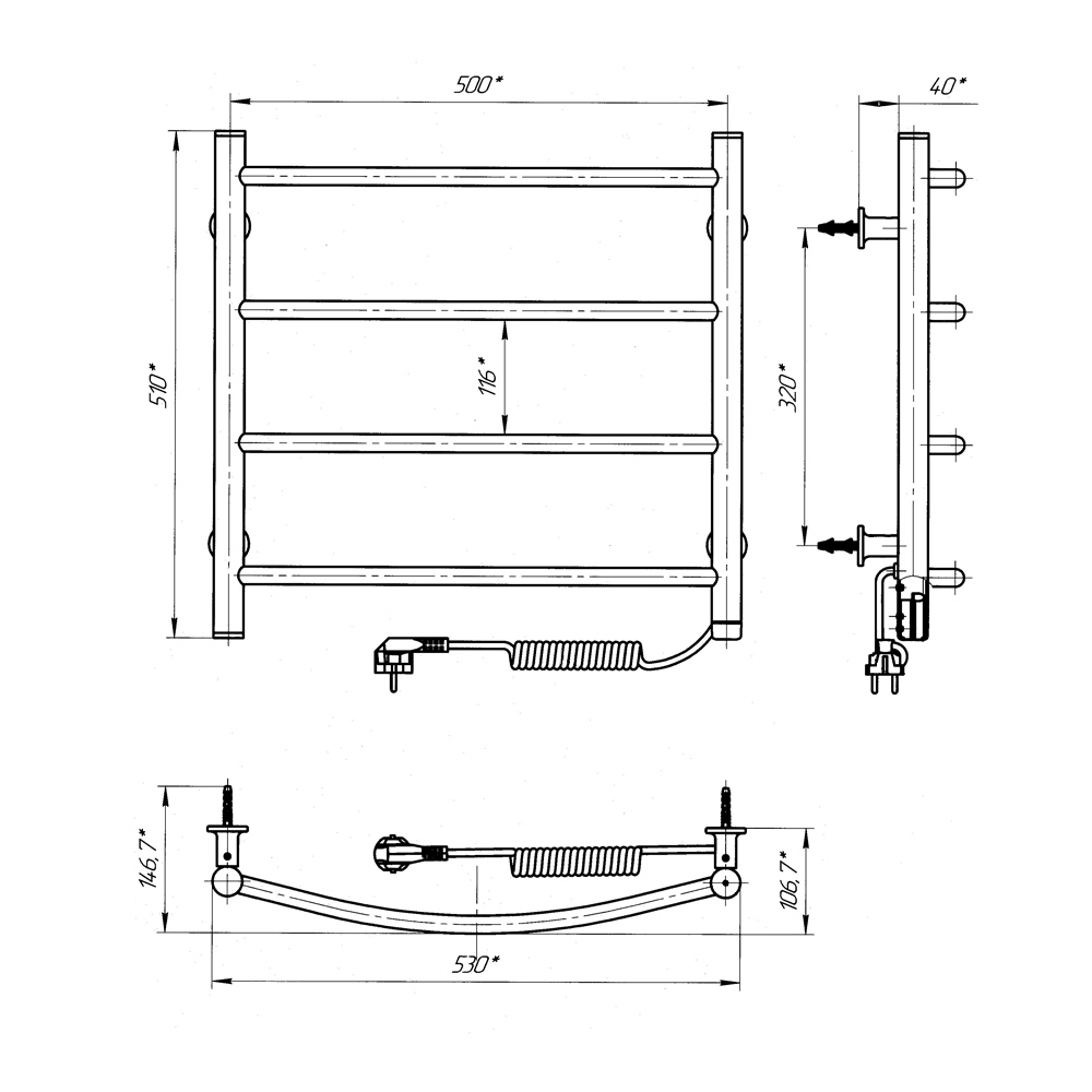 Комплектація:Рушникосушарка – 1 шт, кріплення (шуруп оцинкований з дюбелем, пластикове кріплення, різьбова втулка, штифт) - 4 шт, ключ шестигранний – 1 шт, упаковка (короб картонний, чохол поліетиленовий, чохол поліетиленовий для кріплення, коробочка для кріплень) – 1 шт., паспорт — 1 шт.
